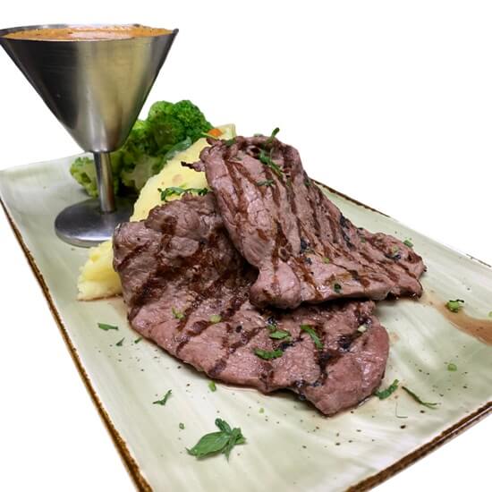 Succulent grilled eye fillet steak accompanied by a rich Dianne mushroom sauce, golden roasted potatoes, and tender steamed vegetables